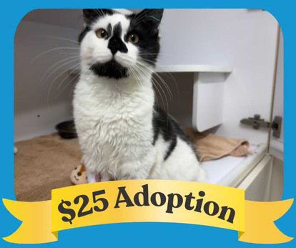 Hi, I'm Mittens. I'm not a tiny kitten anymore, but I'm not quite a grown-up cat either - you could call me a "catten," right in the fun in-between stage. I'm eight months old, a big, gorgeous boy with striking black markings on my face that make me impossible to forget.
