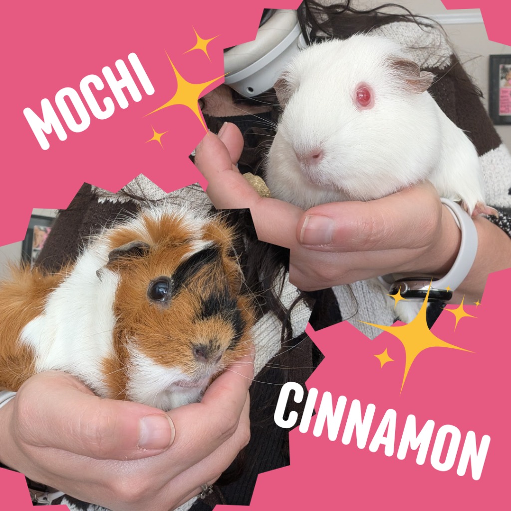 Mochi & Cinnamon are a stunning pair of 3 year old bonded girls. Mochi is a cheeky Himalayan pink eyed-white girl with the chubbiest cheeks, and her best friend Cinnamon is a gentle, shy tri-coloured Abyssian queen.