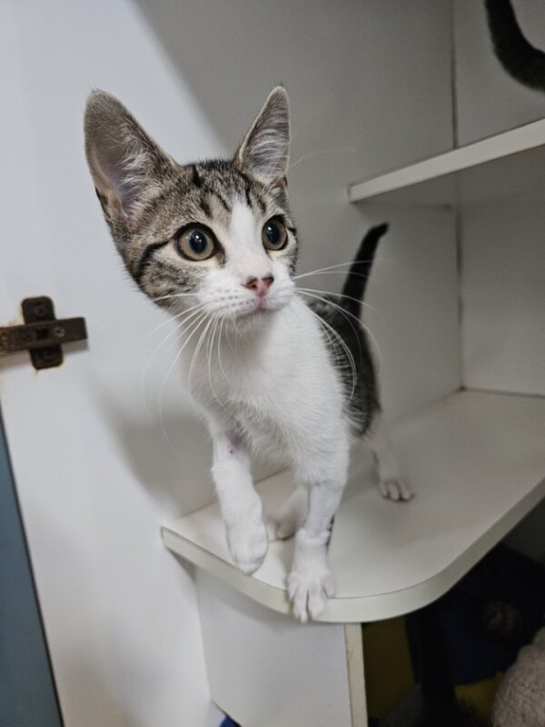 Hey there, I'm Angel Dust. I’m a friendly and affectionate kitten who would suit most homes! My playful paws are always ready to pounce on anything that moves. I love playing with wand toys and mysterious shadows on the wall! When I’m finished playing, I love nothing more than finding a warm lap to curl up in. I have perfected the art of the irresistible purr. It's like my secret weapon for getting all the cuddles and chin scratches I could ever want. Life's just one big, exciting string of moments, and I'm here to make every second count – whether I'm chasing my tail or sharing some purr-fectly quiet time with my favourite humans. So, if you're up for a bundle of furry fun and a lifetime of companionship, please consider adopting me!