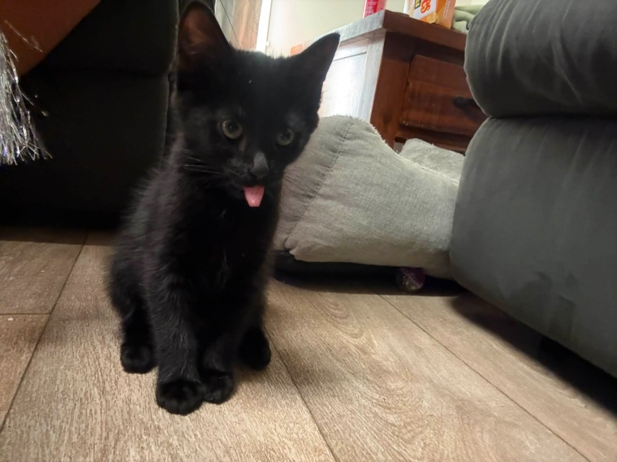 Meet Phantom, a delightful little black kitten whose curiosity and bravery are unparalleled. With bright, inquisitive eyes, Phantom is always on the hunt for adventure within the safety of your home. His coat shimmers in the light, adding a touch of elegance to his already charming presence.