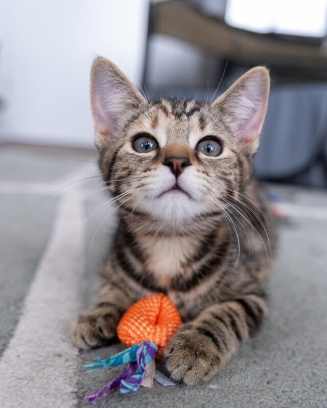This cheeky kitten believes life is all about play, with wrestling sessions and chase games with her sister being high on her list of favourite activities. Paper balls and dangling toys are always a hit, and she brings plenty of energy and enthusiasm to every game. When she is not racing around, she is usually plotting her next adventure or watching the world with curious eyes. She loves climbing up the back of her carer’s desk chair and launching herself off it like her own personal obstacle course.