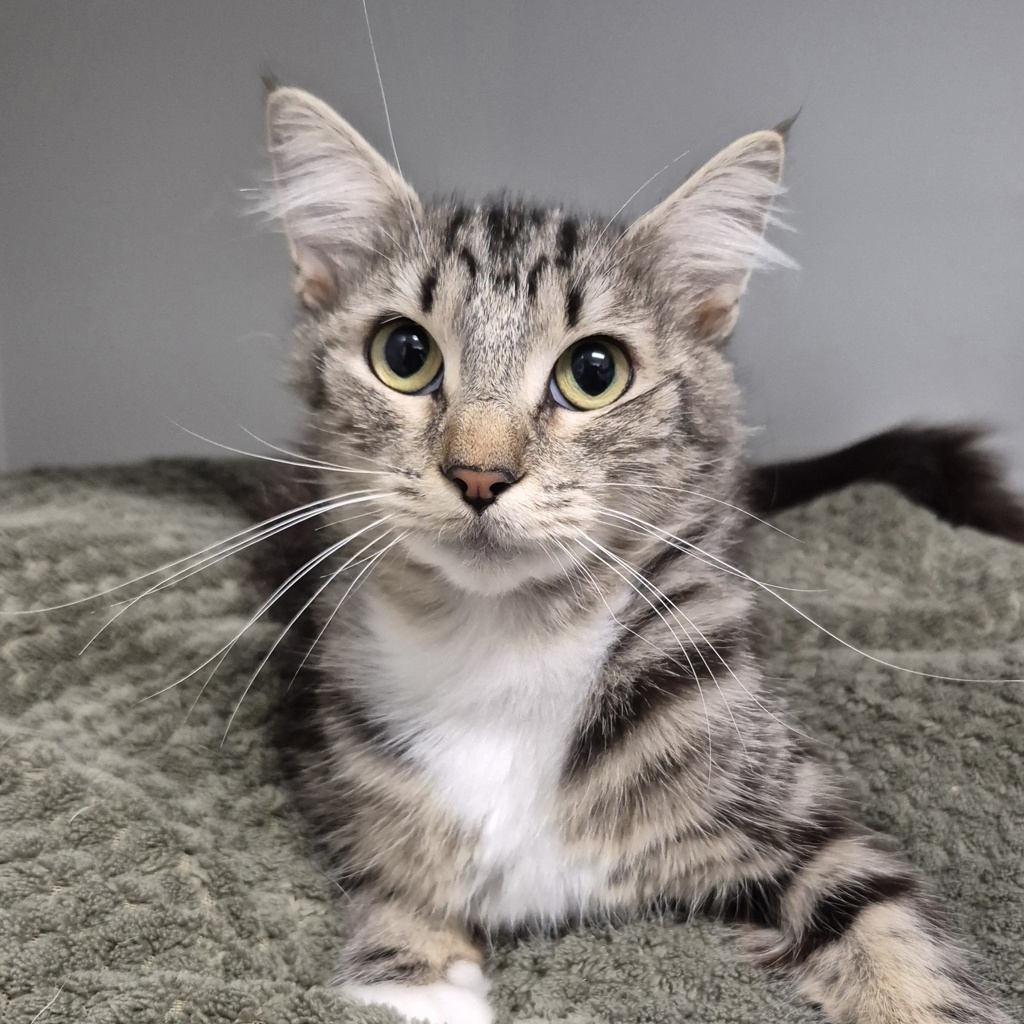 She came to us with no history, but from day one Grape has been a beautiful, gentle little kitty. She may be unsure at first, yet her curiosity always peeks through, guiding her closer to the people around her. With time and kindness, she blossoms into a devoted companion who will happily follow you around the house, soaking up every head scratch you are willing to give.