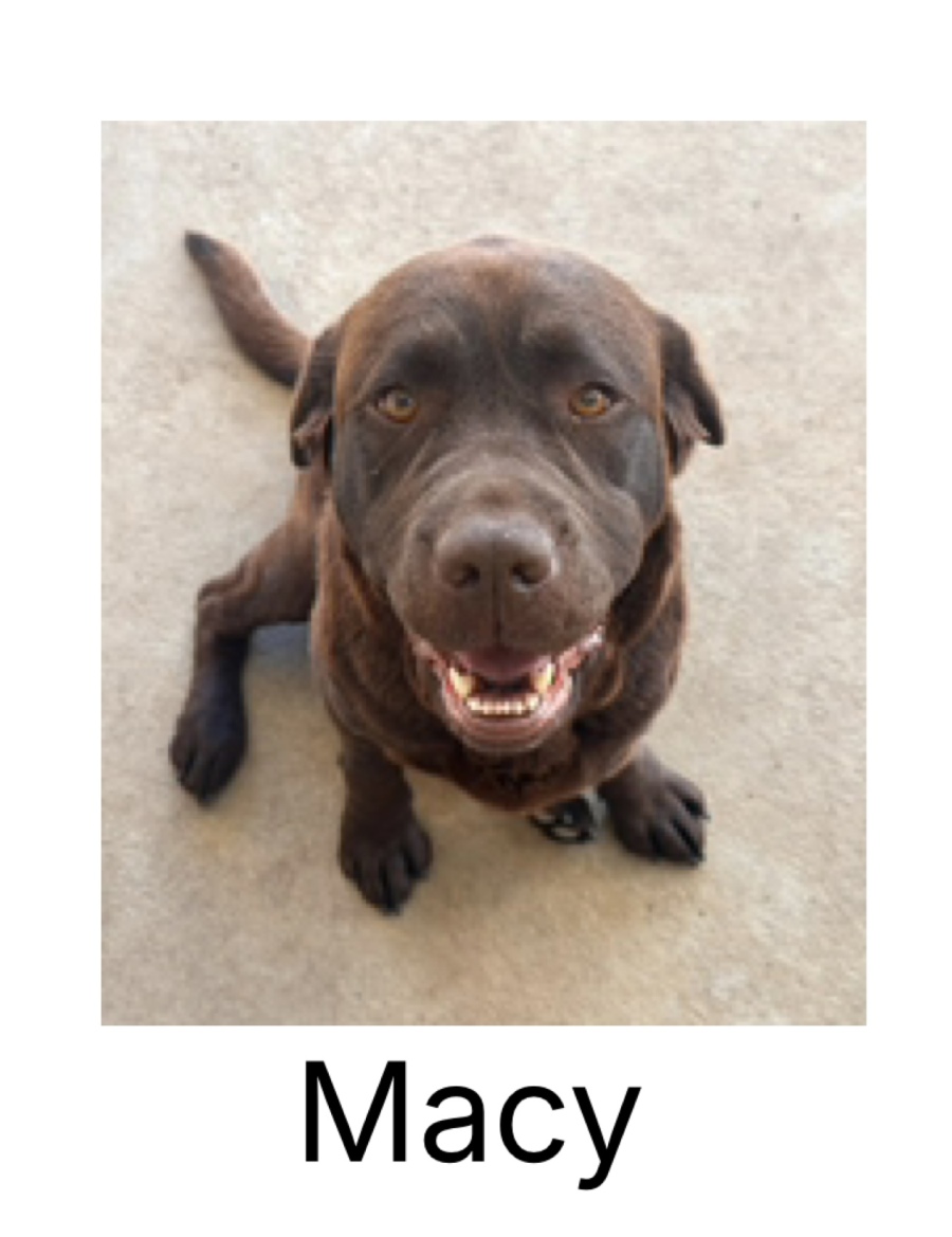 Meet Macey, a loving and gentle Chocolate Labrador with a heart as big as her endearing eyes. At 5 years old, Macey is a playful and affectionate companion. Alongside her mother, Ruby, this bonded pair needs a family who can cherish them both. Macey has an very loving personality, getting along brilliantly with humans and other dogs. She's child-friendly and relishes playtime in the outdoors, making her an excellent fit for a family with a spacious backyard. Macey has some digging tendencies, but her cheerful disposition and loyal companionship more than make up for any mischief.