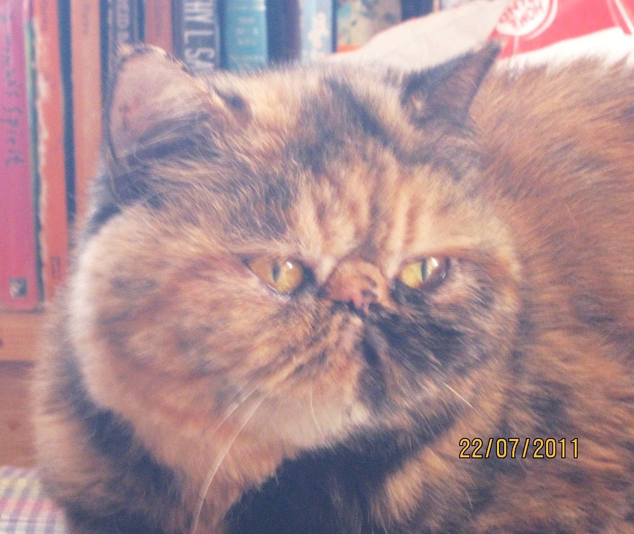 Hepzibah - of no value to her breeder - was to be euthanased until we were advised of her plight. She is an enchanting little soul who runs around in circles with her back slightly arched when she is glad to see you and also does meercat impersonations. She doesn't mind other cats unless they have the audacity to attempt to share her bowl! hepzibah likes to sleep on tabletops in sunny locations but as a former show cat does not like being confined in a cat basket. Her unusual markings are a constant source of wonder - just looking at her can only bring joy to anyone lucky enough to share their household with this little cutie!