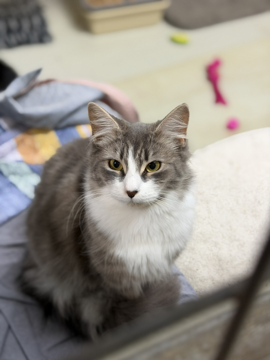 Greta had a rough start and came to us as a stray. It took a long time for her to trust humans, but she has made incredible progress with one very dedicated staff member (who, full disclosure, is completely obsessed with her!). Over time, Greta showed she preferred playtime over treats in her one on one sessions, revealing her playful, kitten-like side with toys. Once she began to open up, we introduced her to other cats, and she was over the moon. Greta feels safest and happiest around feline company, which helps her continue to grow in confidence. Greta loves to come out to explore, say hi to all the cats in her area, and we often catch her playing happily with her toys.