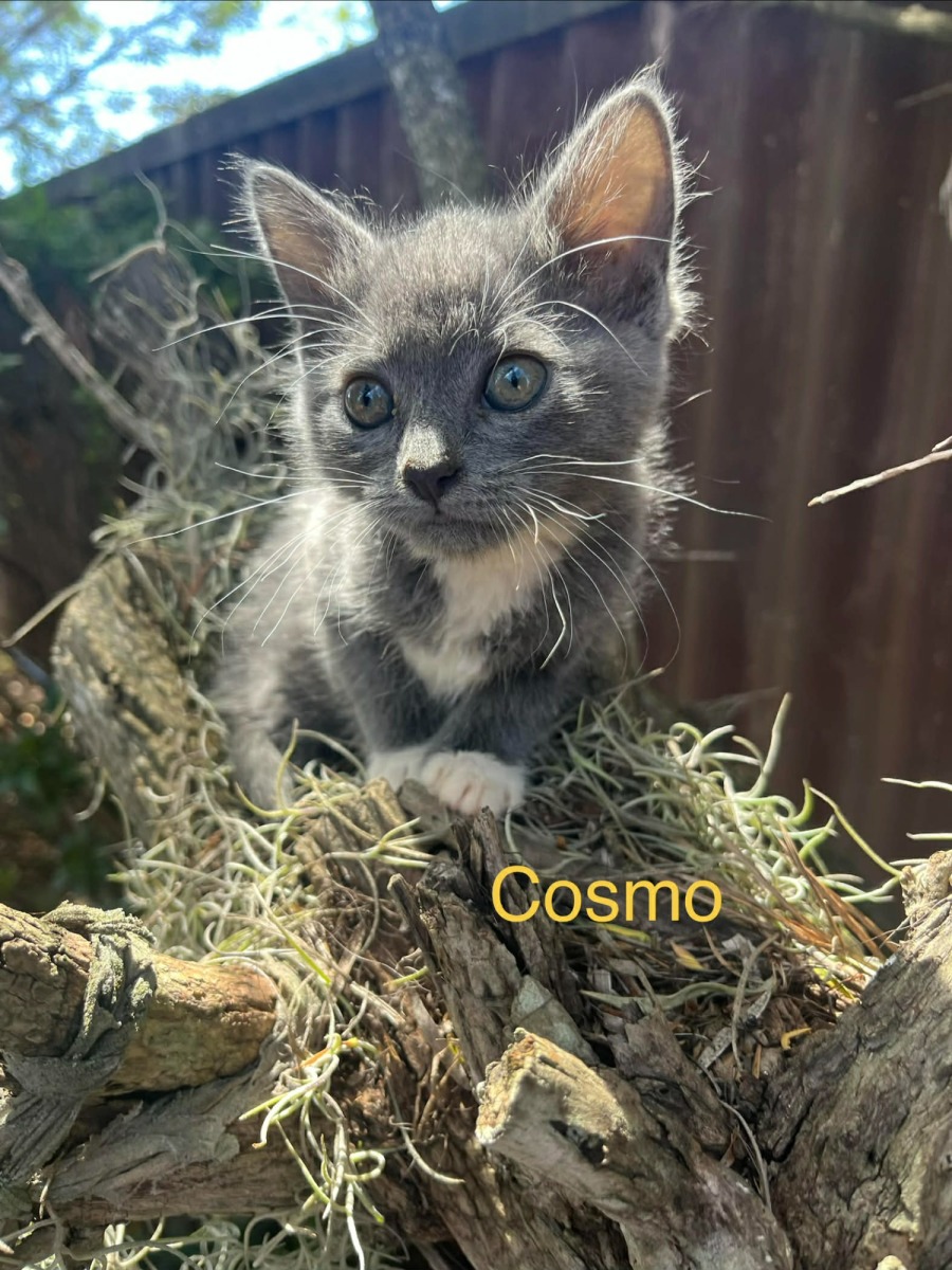 Meet Cosmo, an adorable 8-week-old Russian Blue X with a sleek short coat. Ready to shower her future family with love, Cosmo is remarkably adaptable and would thrive in various family settings. Her affectionate persona leads her to follow her human companions like a little shadow, though she's ultimately at ease sitting cozily by your feet or perched contently on your shoulder.