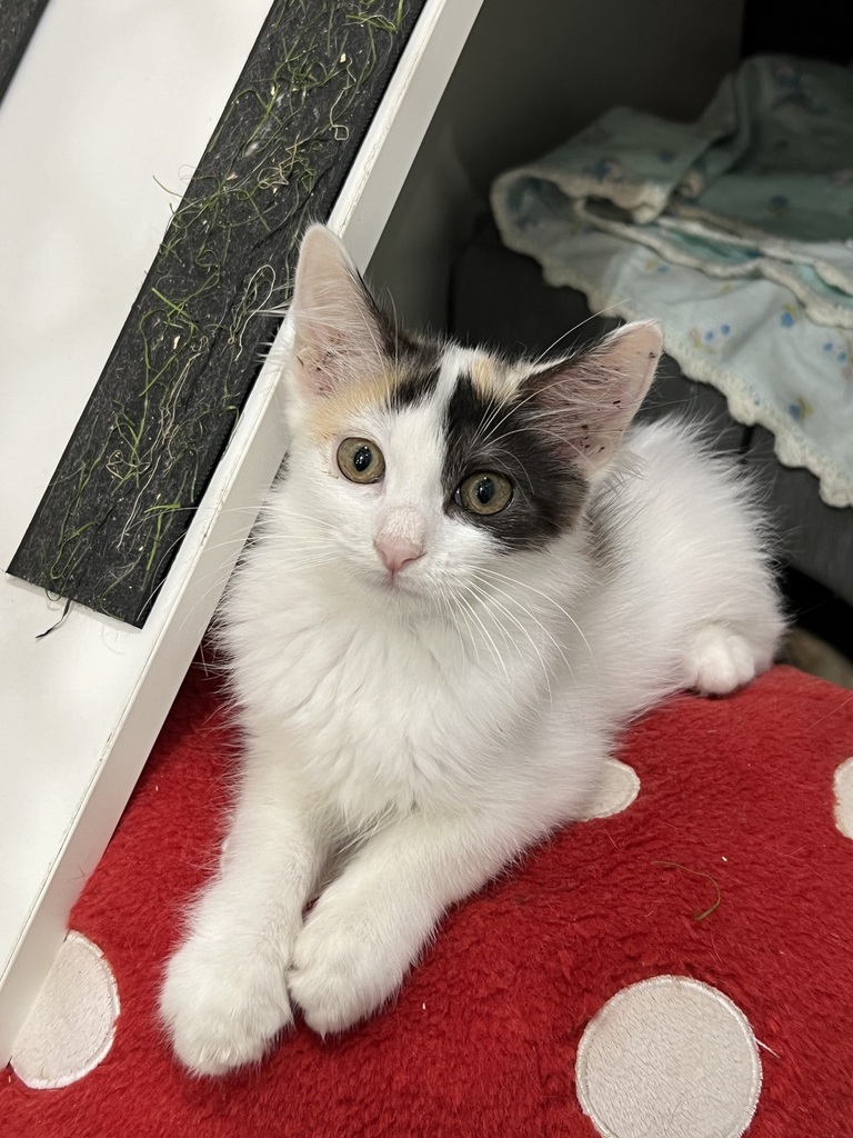 Lou Lou is a curious little girl with a lovely white and blue cream calico coat. One of her most charming features is the adorable patch over one eye, which gives her an extra dose of cuteness and character.