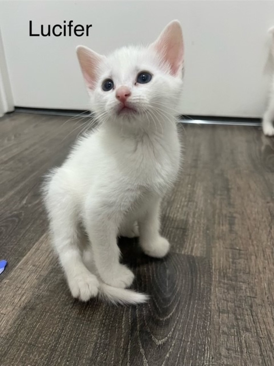 Lucifer may have a mischievous name, but he’s nothing but pure charm. This bright‑eyed kitten is friendly from the moment you meet him, greeting new people with curiosity, confidence, and an eagerness to play. He’s the kind of little guy who brings instant energy into a room, always ready to chase a toy, pounce on a feather, or curl up for a quick cuddle break before zooming off again.