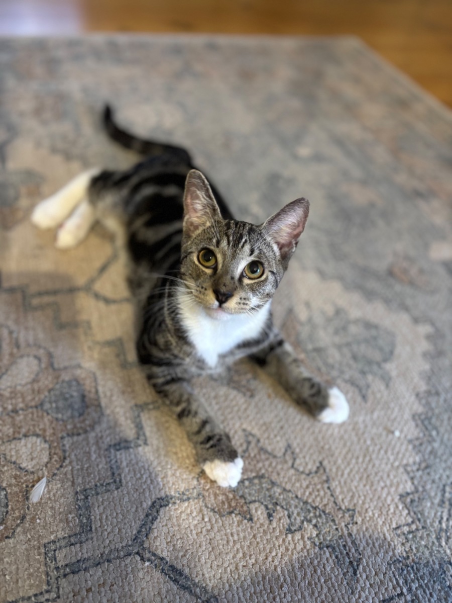 Oscar is a 5-month-old tabby and white Domestic Short Hair kitten with a big personality and an even bigger heart. While he can be a little timid when meeting new people, it doesn’t take long for his confident and playful nature to shine through once he feels comfortable.