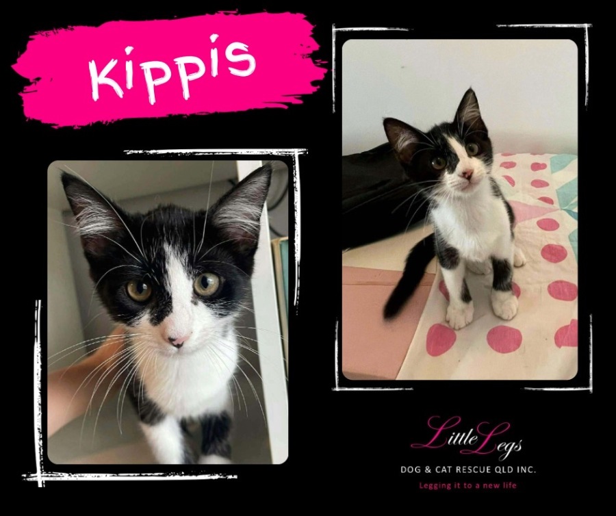 Meet Kippis, a little sweetheart of a kitten, who is sure to capture your heart. She arrived at her foster family’s home after being rescued from a pound with her brother Kanpai. Kippis has a black and white coat and cute tiny paws. Even though she is the smaller of the siblings she doesn’t let that slow her down or the other kittens push her around. Kippis loves her toys, climbing up on the cat tower and has recently discovered the joy of running up and down the staircase. She is affectionate with humans and is already an expert at winding in and out of your legs. Kippis loves to nap with her humans and snuggle up with her feline friends. We know she will make her forever family very happy!