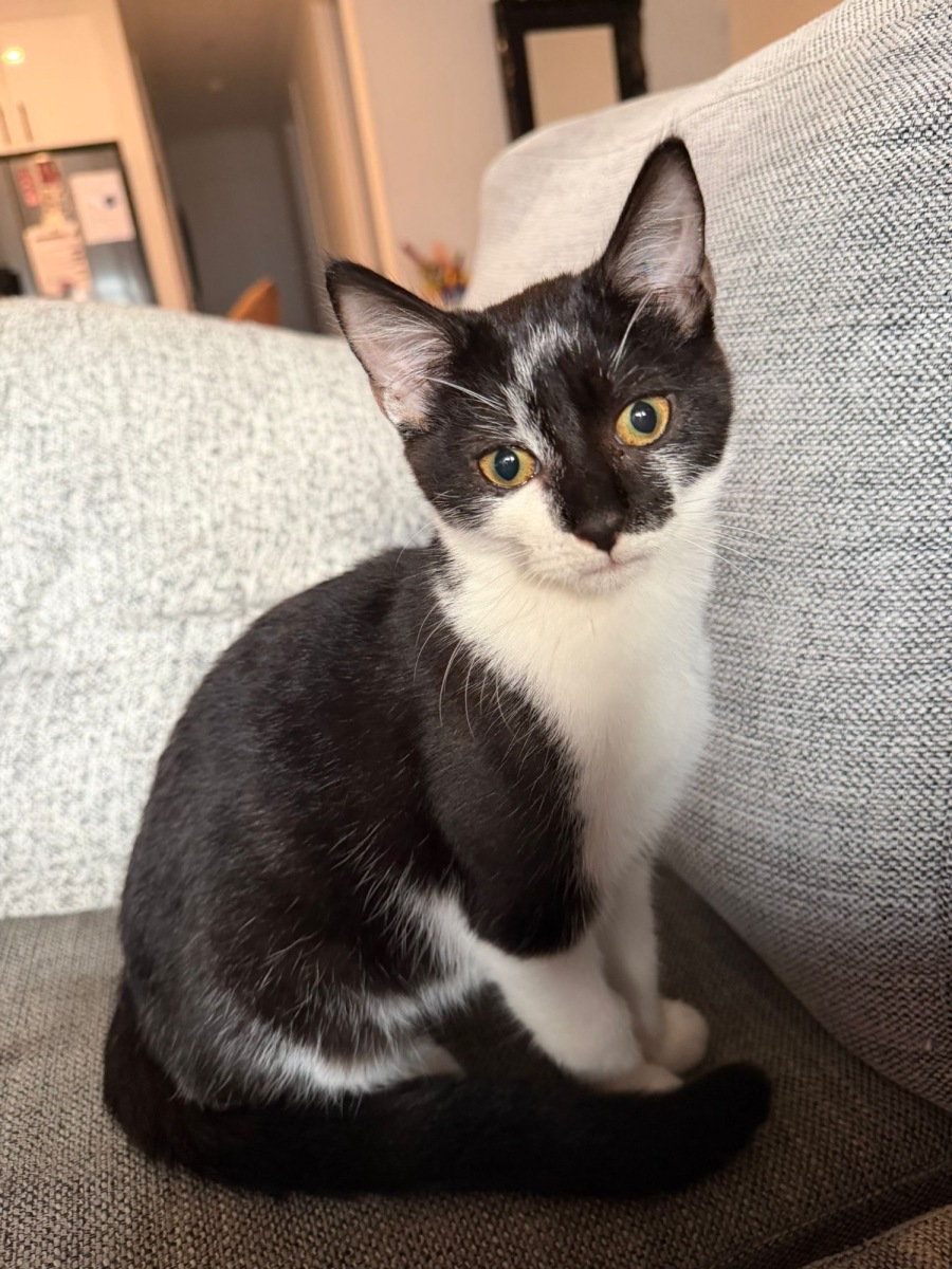 This sweet girl has a calm thoughtful vibe mixed with sudden bursts of zoomies for no clear reason. She would thrive in a home that appreciates a kitten who can be both a dignified lady and a chaotic noodle within the same five minutes.