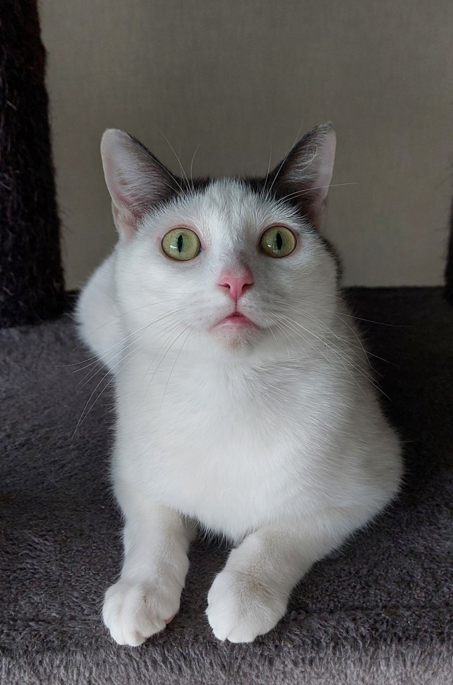This gorgeous girl is the sweetest kitty you’ll ever meet. She is so loving, and seeks affection and cuddles often. She loves to snooze on your lap while you watch tv or work, with the softest purr. She really loves pats and affection, and boops her head into you to ask for pats.