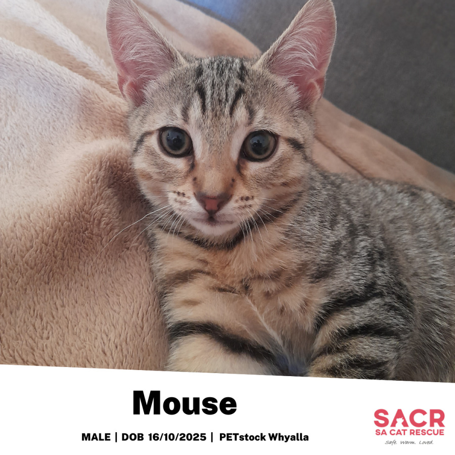 Mouse's adoption fee is $195 which includes desexing, microchipping, parasite prevention, and initial F3 vaccination.