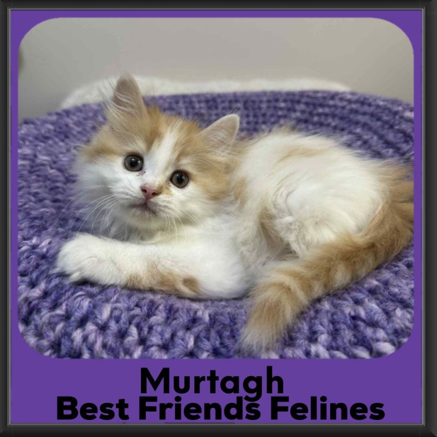 Murtagh is an absolutely stunning fluffy kitten with a beautiful ginger coat dotted with charming white spots — he’s a little piece of sunshine wrapped in fur. While he can be a bit shy at first, this gentle boy has a super sweet personality and plenty of love to give once he feels safe and comfortable.