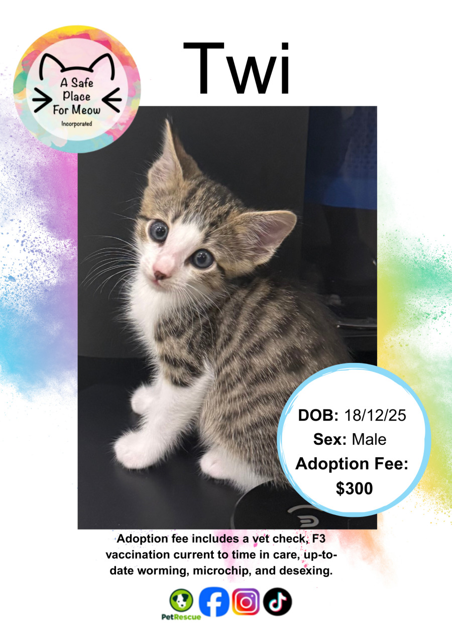 Twi would suit a home that can offer love, interaction, and enrichment. He would thrive with another friendly cat or kitten to keep him company. With his sweet nature and good looks, Twi is sure to win hearts and bring plenty of happiness to his forever home.