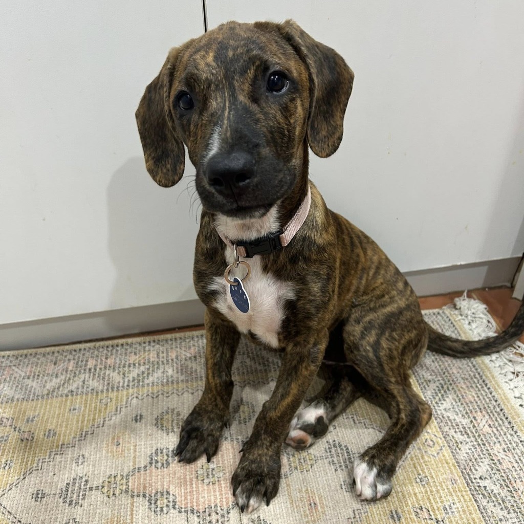 She adores cuddles and will happily climb onto a lap for belly-up snuggles, especially with kids who she absolutely loves. She enjoys water play, even if baths are still something she’s getting used to.