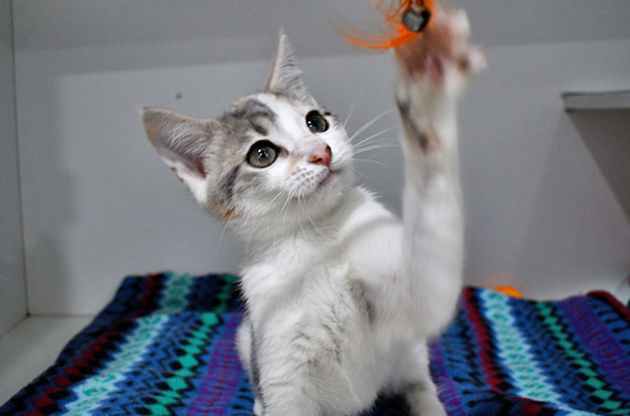 Drew is a soft and sweet kitten who might seem a little shy at first, but don’t be fooled, she’s just saving her energy for play time! Once she’s ready, she’ll be darting after toys and exploring her surroundings with curiosity. Drew purrs when picked up and enjoys being around people. She’s gentle, social, and always has a friendly, happy vibe.
