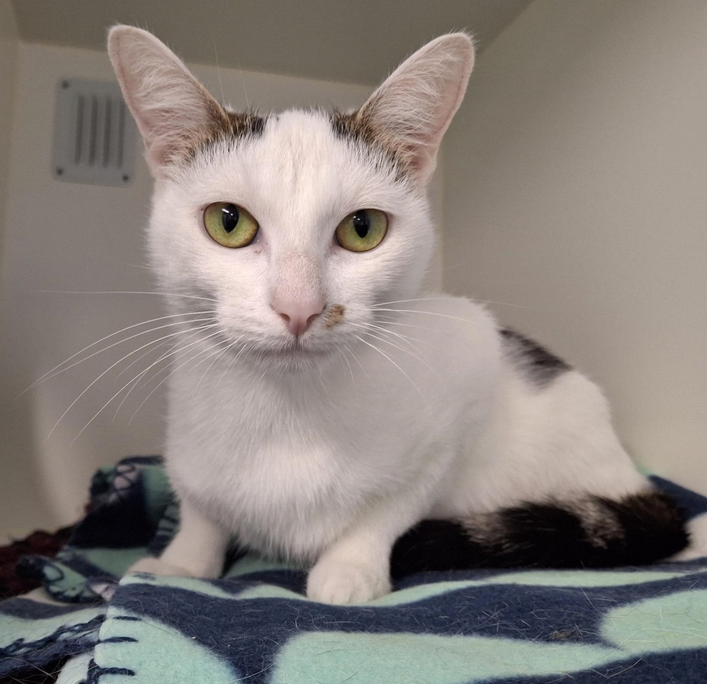 This beautiful white and tabby girl is searching for her purrfect furever home.