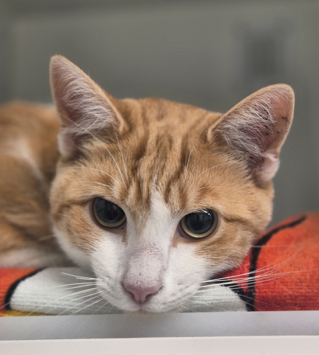 I'm a handsome ginger tabby and white lad with light features, which means I'll need to be an indoor-only cat to keep my sensitive skin safe from the sun. Honestly, that suits me just fine - the big outdoors can be a bit overwhelming for a gentle soul like me anyway.