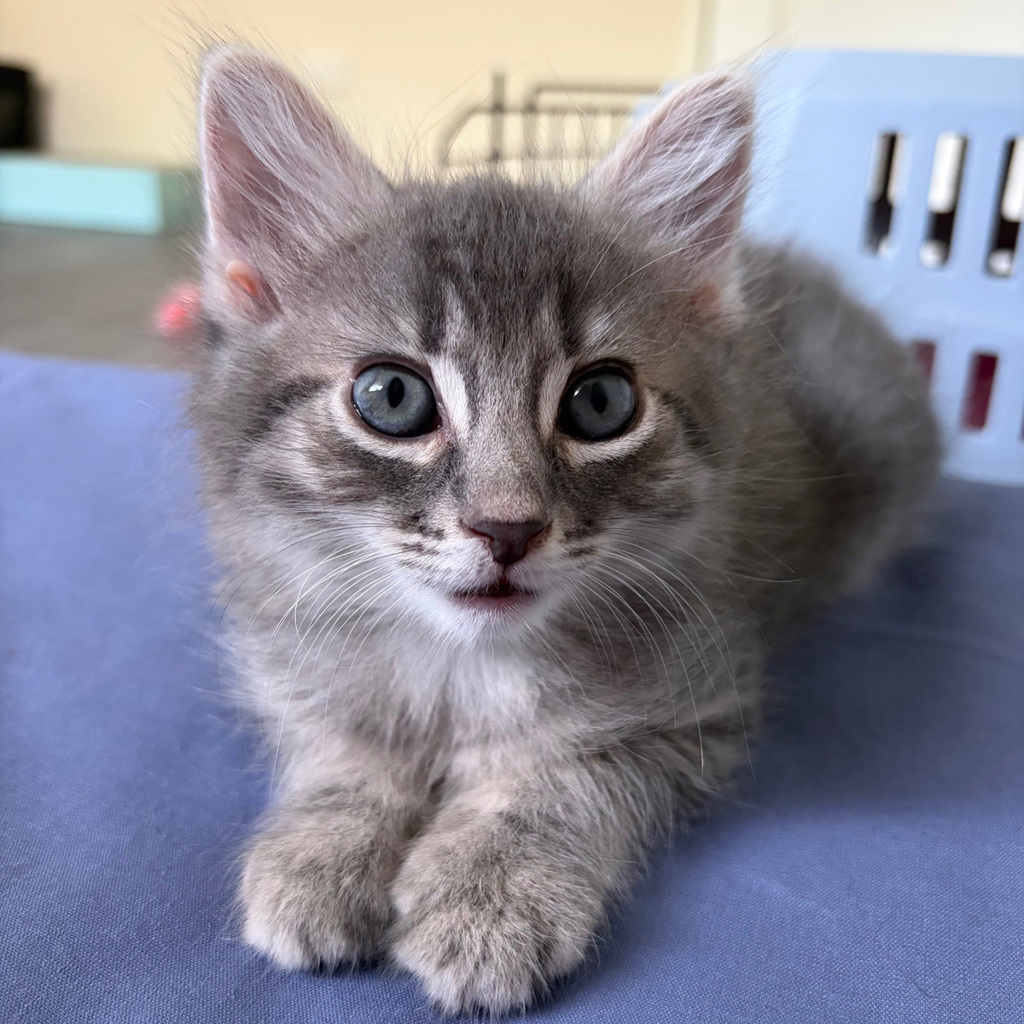 Little Joanie is an adorable 8-week-old grey tabby with a massive fighting spirit, a big heart, and more personality than you'd expect from such a tiny package. This little pocket rocket of fluff is all about action - wand toys are her absolute favorite, and if your feet dare to walk past without stopping to play, consider them officially under attack. Fair warning: Joanie takes playtime very seriously.