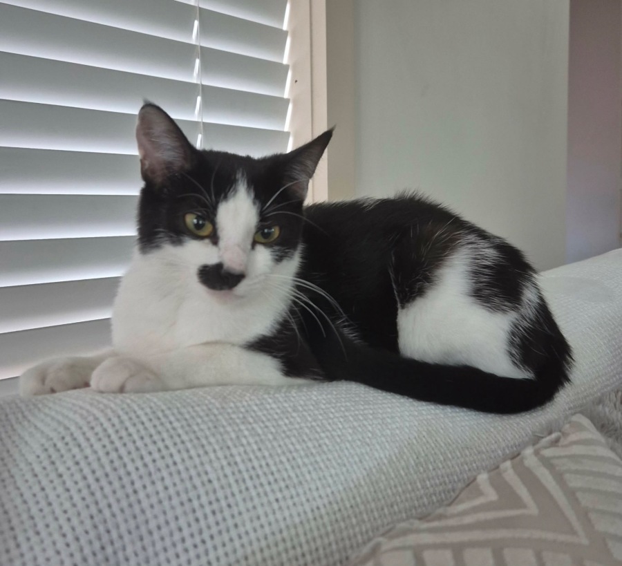 Meet Mabel, a sweet and loving feline with a heart as big as her unique black and white coat. Rescued alongside her kittens, Mabel is now seeking a special person or family who wishes for a devoted cat to shower with affection. Her gentle nature and striking markings make her not just a pretty face, but a delight to have in your home.