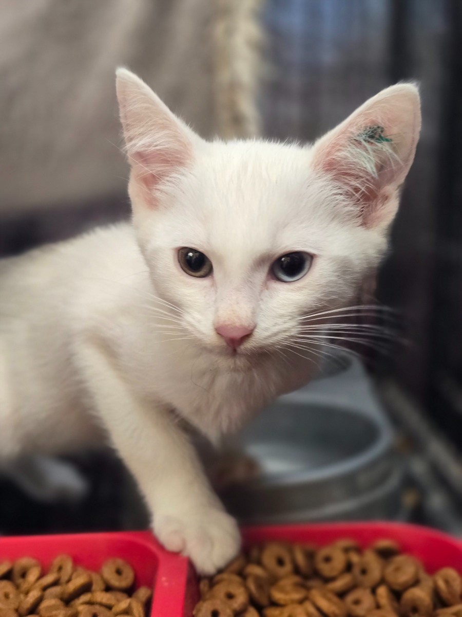 Introducing Arastoo, a stunning little feline with an elegant white coat that makes him a striking addition to any home. Arastoo is as charming as he is adorable, and his cute presence is bound to melt your heart. With a playful spirit and a heart full of love, he requires a loving, fun home where his vibrant personality can truly shine.
