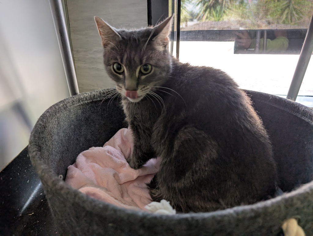 Ziggy is a threeâyearâold domestic short hair with a gorgeous grey tabby coat and a personality that shines just as brightly. True to her name, she zips, darts, and dances her way through life, bringing energy and charm to every room she enters. Confident and full of spark, she loves being right where the action is - whether that's chasing a toy, supervising household activities, or curling up nearby to keep you company.