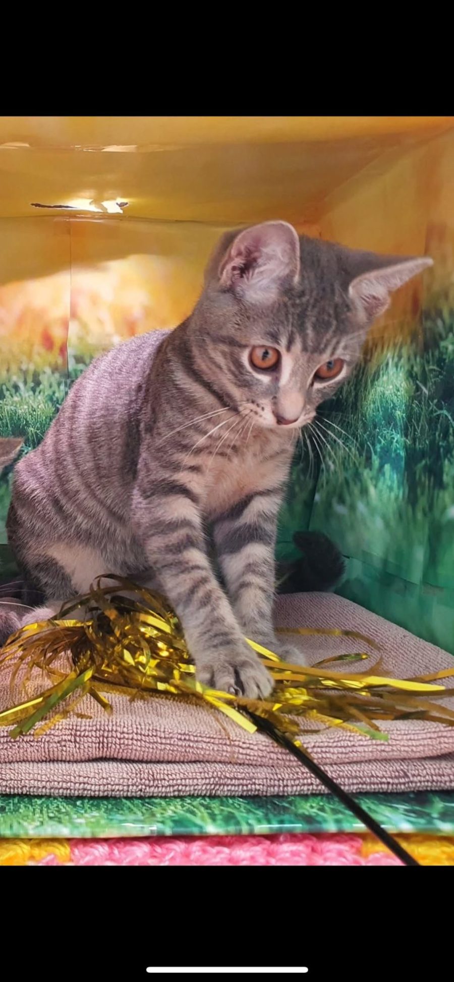 Fig us a very attractive grey tabby boy super confident loves everyone was confident enough to be carried around the vet hospital for cuddles not fazed by a thing he has had his vet work done uses his litter tray well and is just a dream to have he loves to chase balls with his foster siblings and race up the cat tree then curl up for a snooze then repeat he is the sweetest boy.