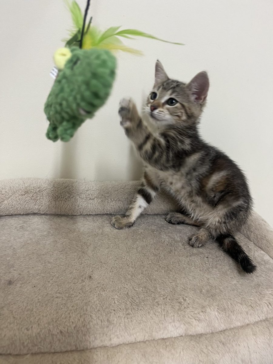 Glitter is a super cute playful girl she loves a cuddle and to chase the feather in a wand race her siblings up the cat tree and chase balls she is litter trained and loves her food she comes desexed vaccinated flea and worm treated she also has siblings looking for their homes