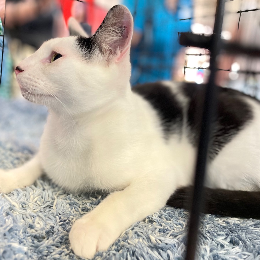 Miff is a domestic shorthaired cat with a short coat. He has a black and white coat displaying patterns that are unique to him.