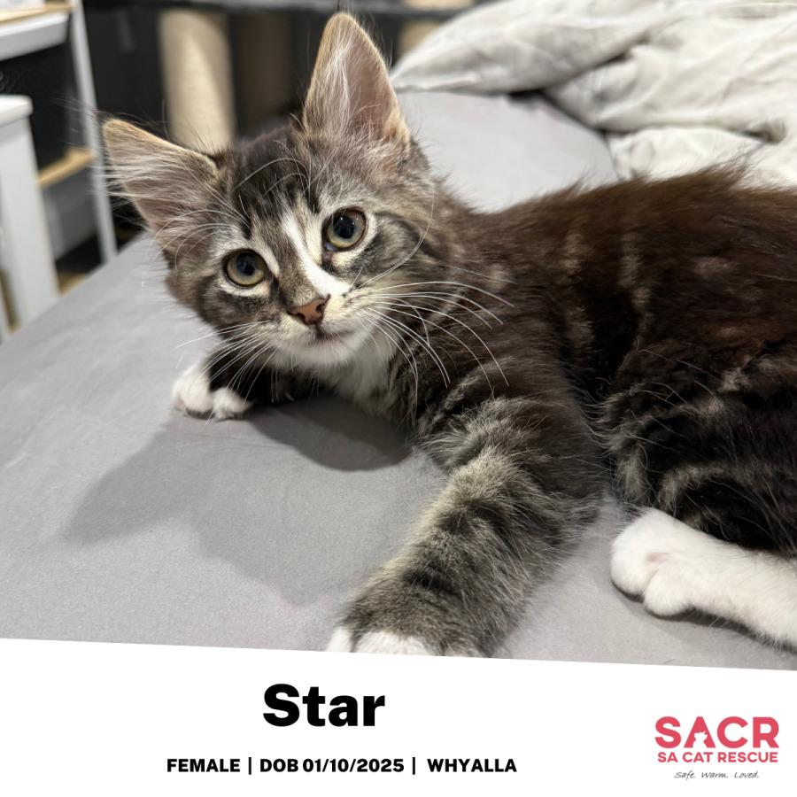 Star is a tabby and white girl kitten who truly lives up to her name. She’s a quiet, gentle little lady with the sweetest nature and one hell of a purr! The moment you pick her up or even give her a soft pat, her tiny motor switches on instantly and keeps going strong. She absolutely adores affection and will happily melt into your arms, soaking up every bit of love you give her.