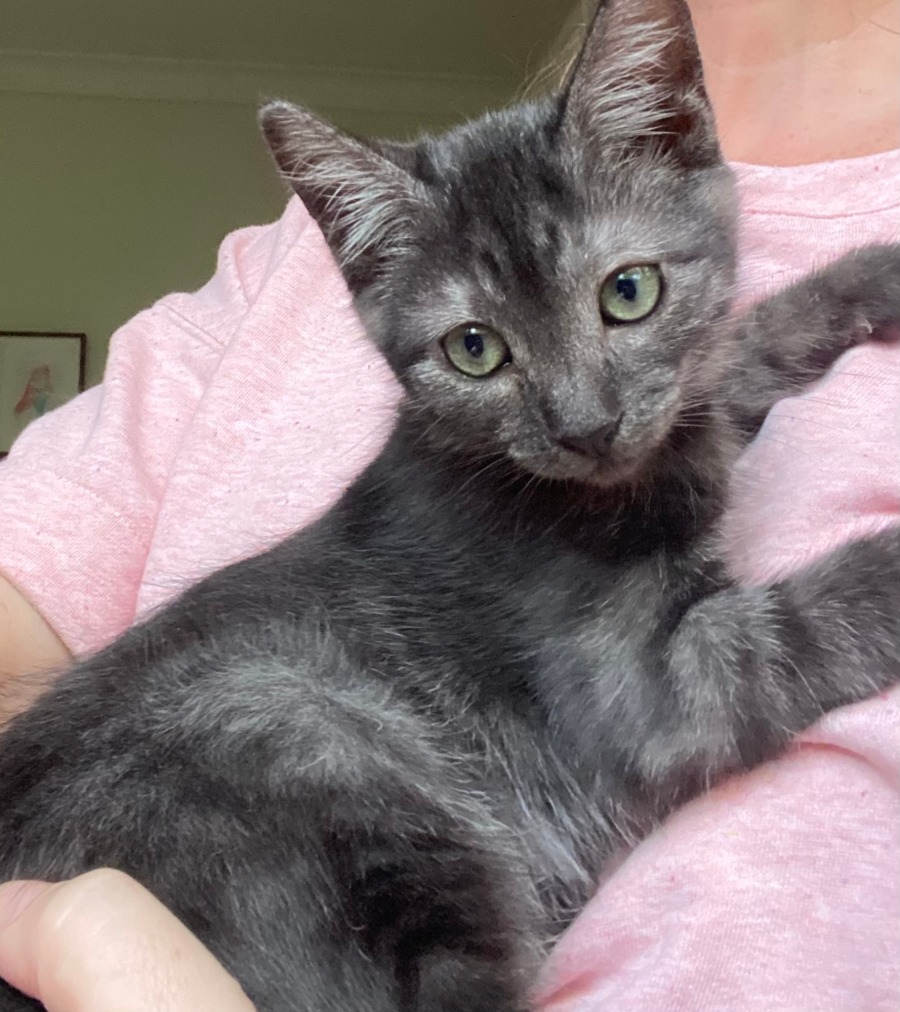 Meet Dustin, an 11-week-old male Black Smoke Domestic Short Hair kitten. With his smokey gray coat and captivating green eyes, Dustin is not just a beauty to behold, but also a wonderful companion full of love and affection. He epitomizes the perfect balance of playful energy and cuddly delight, eagerly seeking out hugs, pats, and chin rubs with anyone willing to oblige.