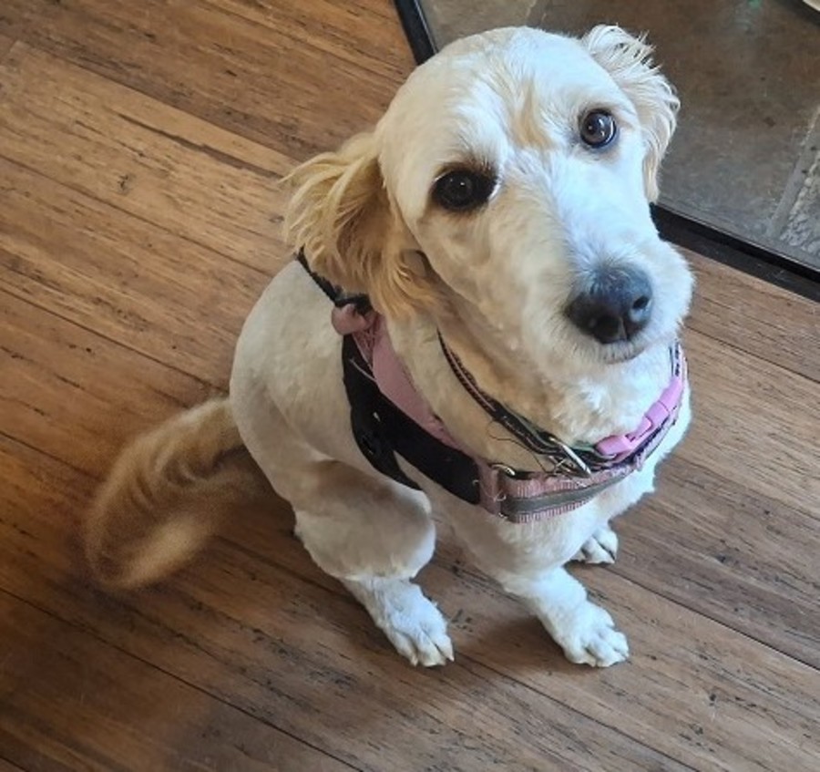 Lunelle knows her basic commands and walks reasonably well on lead, though she’ll need continued gentle training and structure. She’s shown no destructive behaviours — no chewing, digging, or escaping. Her only “naughty” habit? Counter-surfing. Salmon skin = yum. Butter = yum. That packet of flour? Also yum 😅