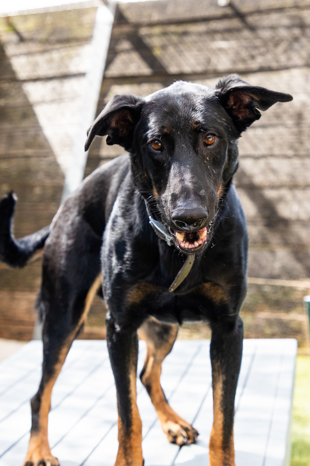 Meet Lonnie, a beautiful girl who is a stunning blend of German Shepherd and Doberman, with the brains and presence to match her looks. She's strong and energetic, so she'll thrive with an experienced large-breed owner who understands confident, active dogs. Her ideal home is adults or older, dog-savvy teens where she can play and train without worry.