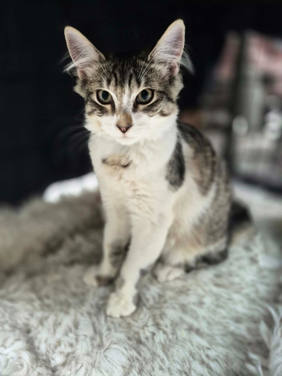 Meet Henry, the adorable medium-haired tabby and white boy with the most divine markings on his nose. This charming kitten has grown up in a loving home environment, and it really shows. Henry has received a lot of love and attention, shaping him into the affectionate and well-adjusted feline he is today.