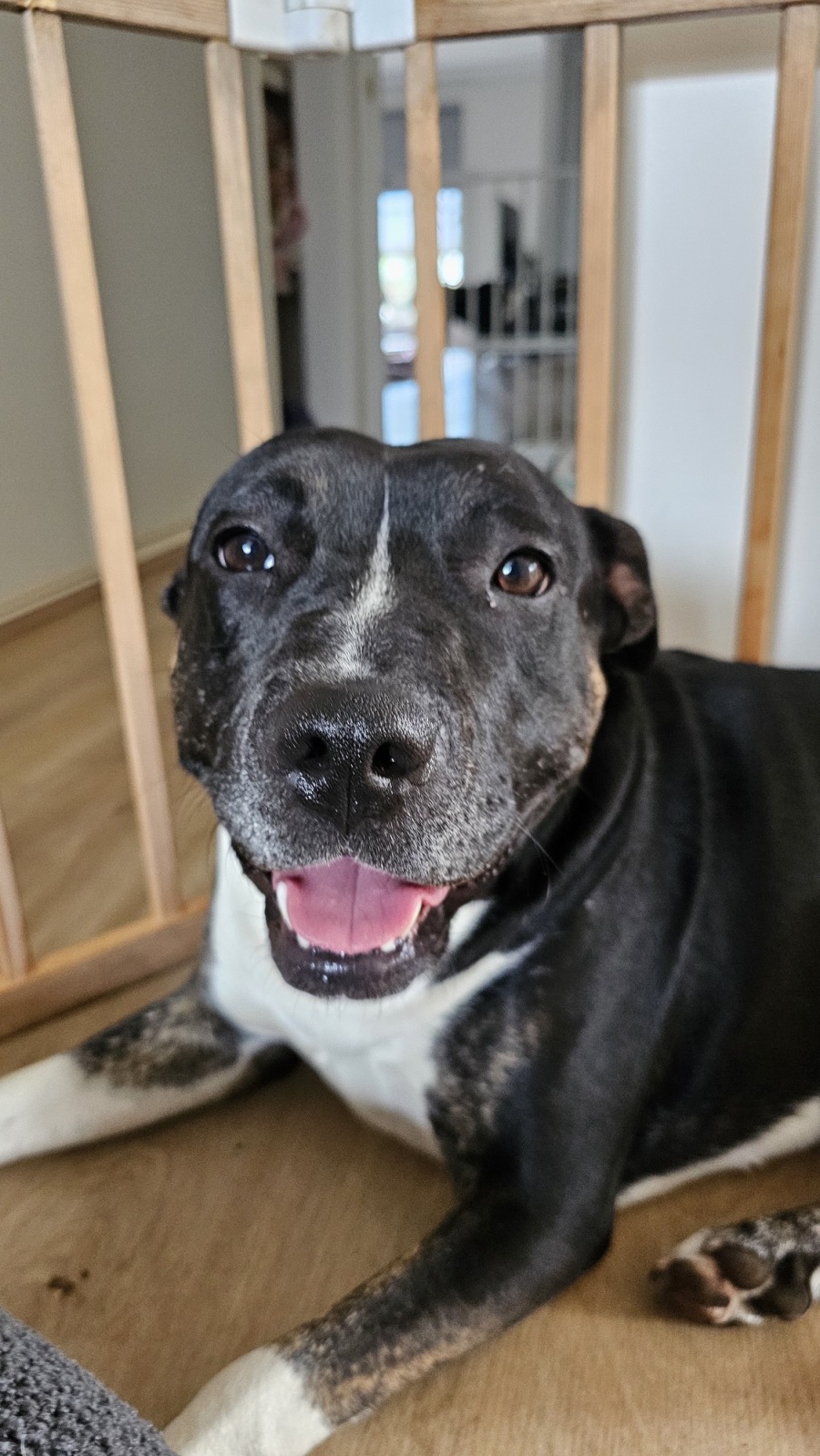 Ella is house trained and has a lovely medium energy level. She enjoys daily exercise and will absolutely zoom around the yard like a goofy, oversized puppy. It’s impossible not to smile watching her. She would thrive in a home with a secure yard and someone home often, as she truly loves companionship and being part of the family. At night, Ella is learning to sleep in her crate and will need some support to settle there. During the day, she will curl up anywhere near you or in a comfy sunny spot, soaking up a nap in comfort.