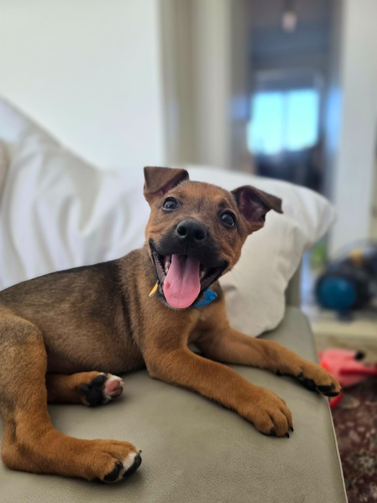 Odie loves exploring his surroundings, squeaky toys, gently annoying his foster brother, and checking in with his person for reassurance and snuggles when he’s tired. He’s beautifully balanced, happy to entertain himself, then just as content to curl up at your feet while you’re cooking, working from home, or relaxing on the couch.