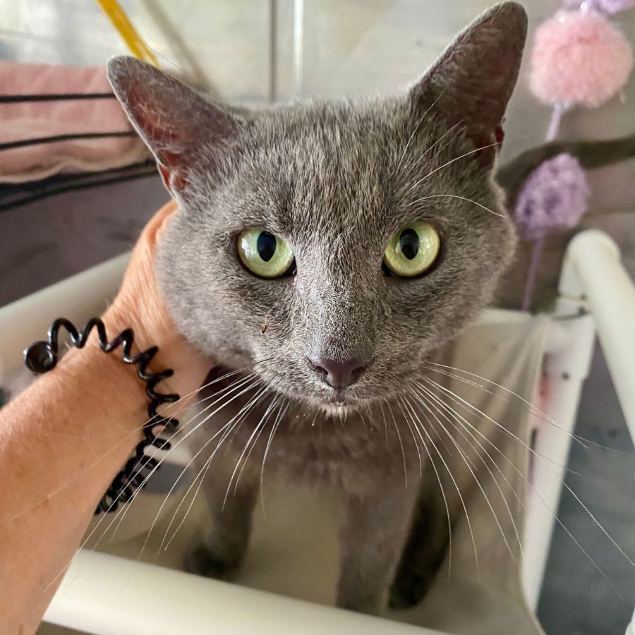 He has a calm, sweet nature and gets along well with our other rescue cats. He enjoys soft bedding (especially his sheepskin), gentle affection, and the comfort of being close to his humans. Timmy is medium‑sized, incredibly handsome, and has that classic Russian Blue charm that makes him impossible not to adore.