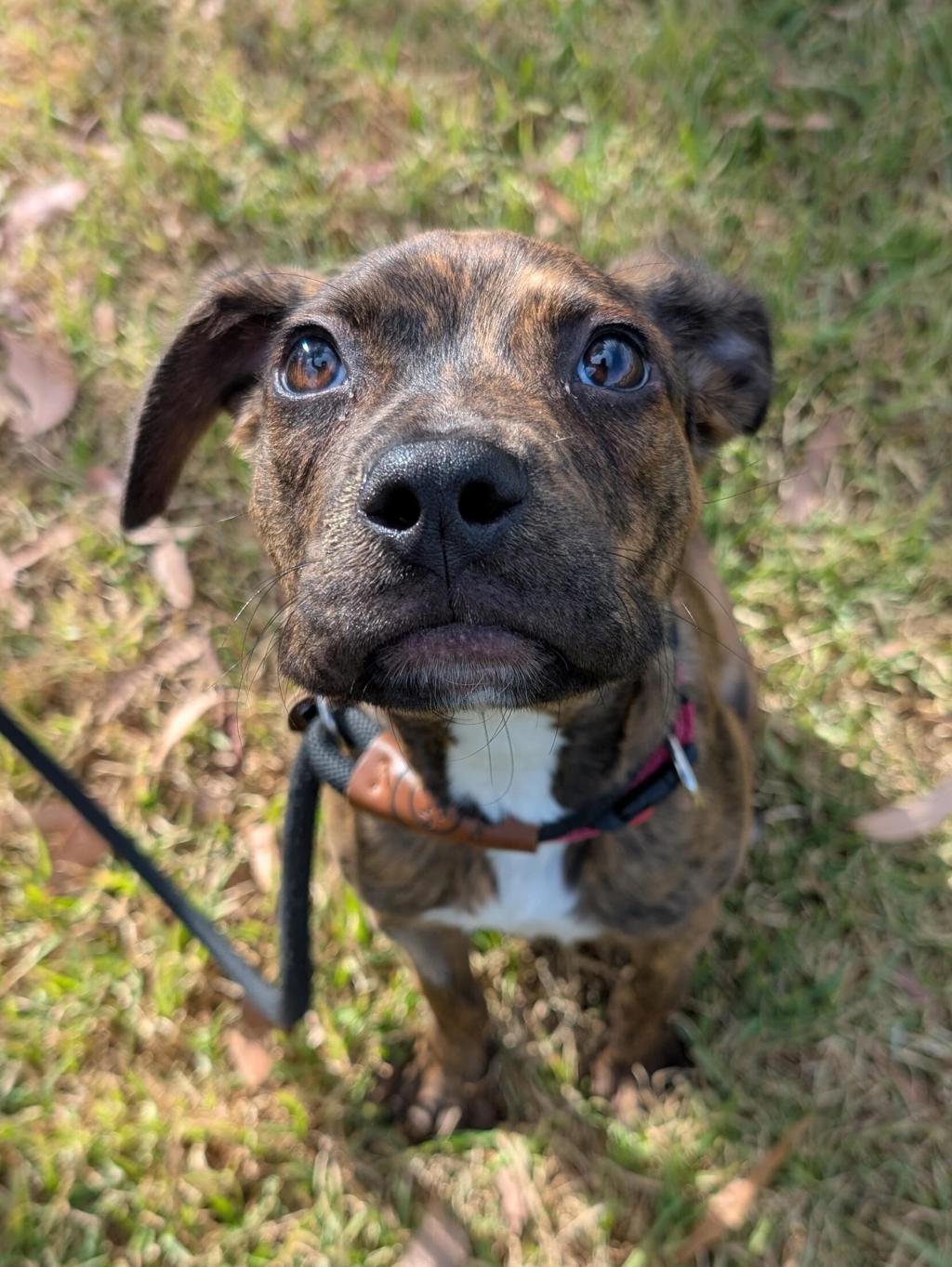 Dangerfield is a sweet young girl who is still learning the ropes and will benefit from ongoing, reward-based training. She is food motivated and responds well to training, which will make her a fun and willing student. Dangerfield still needs some help learning to trust people, so building her confidence through positive reinforcement and confidence boosting games will be important. She is a friendly, gentle girl who has all the potential to grow into a confident dog in the right home. She would thrive alongside a calm, confident canine role model, pending a meet and greet. She may also be okay with older children who respect her space.