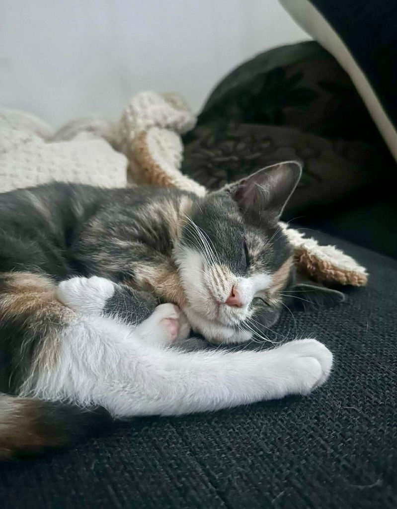 True to her name, Ruby loves to “hop” into action. Whether it’s chasing a rogue bottle cap, “helping” you tie your shoelaces, or scaling the cat tree like a tiny mountaineer, she approaches life with enthusiasm and curiosity. She’s the kind of kitten who turns everyday moments into fun.