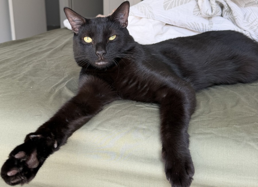 Hugo absolutely adores people. He will often pop out from nowhere and rub on his carers legs, purring with contentment. When Hugo isn't doing zoomies and scooting under blankets, he will seek out his carers lap for a snuggle. Hugo also loves to lay stretched out on his back, receiving belly rubs.