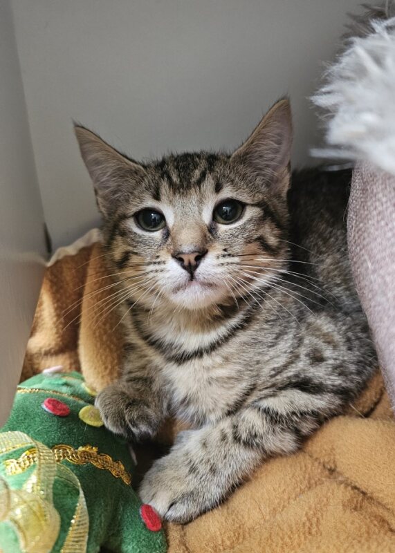 Chip is a gentle, reserved young kitten who is still learning that people and home comforts can be safe. She tends to shy away at first and will often choose a hiding spot when things feel unfamiliar, but a creamy treat is the quickest way to earn an introduction. Spend a little time with her and bring out a toy, and you’ll see a different side - curious, playful, and eager to engage, just with a careful approach. Chip will play and explore, but she likes to take things slowly and think it through first.