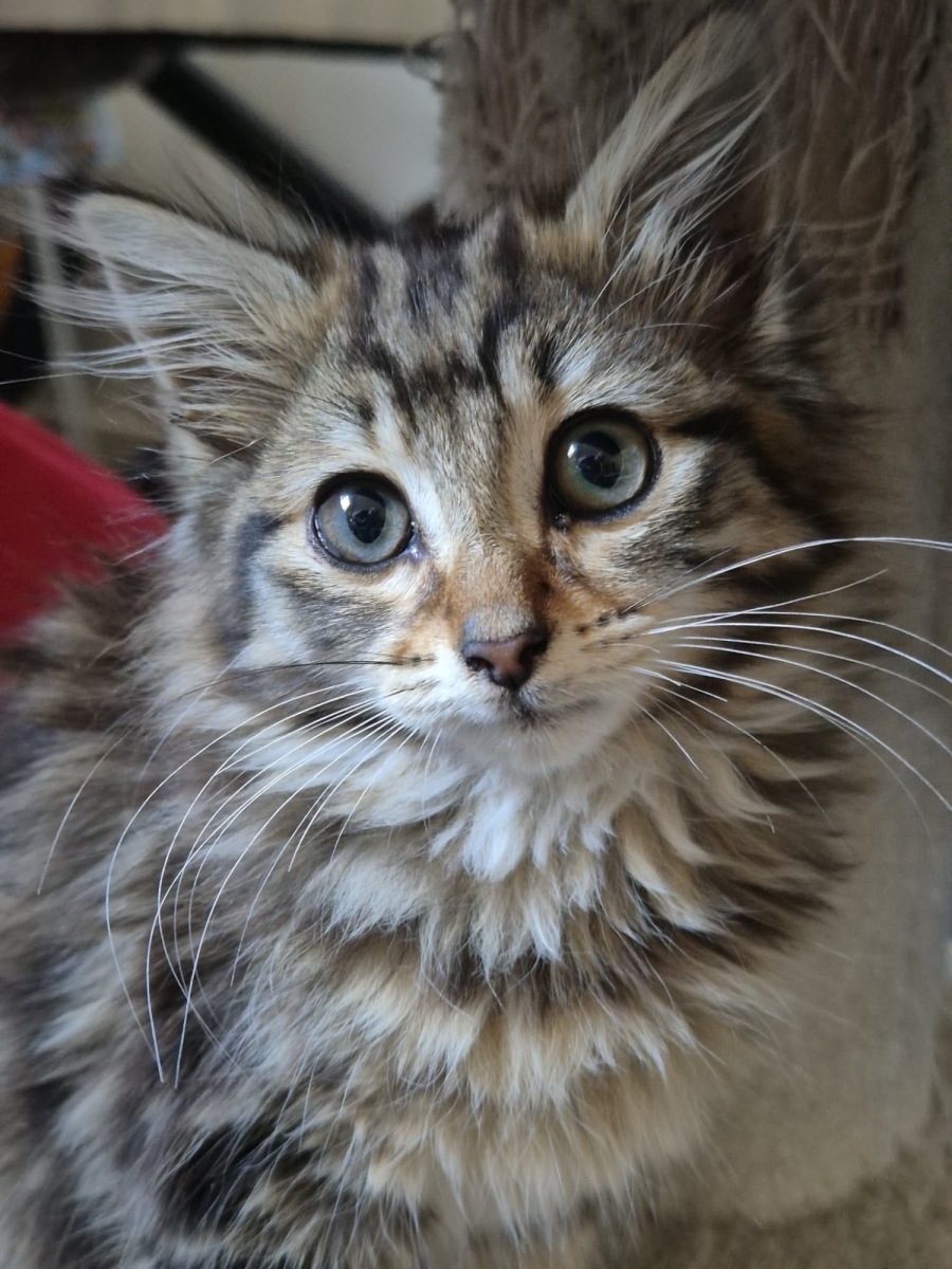 Her favourite things to do are cuddling, playing with her foster siblings and chasing toys! Her favourite sleeping spot is high up on the cat tree, so she can keep an eye on everything going on 🐾