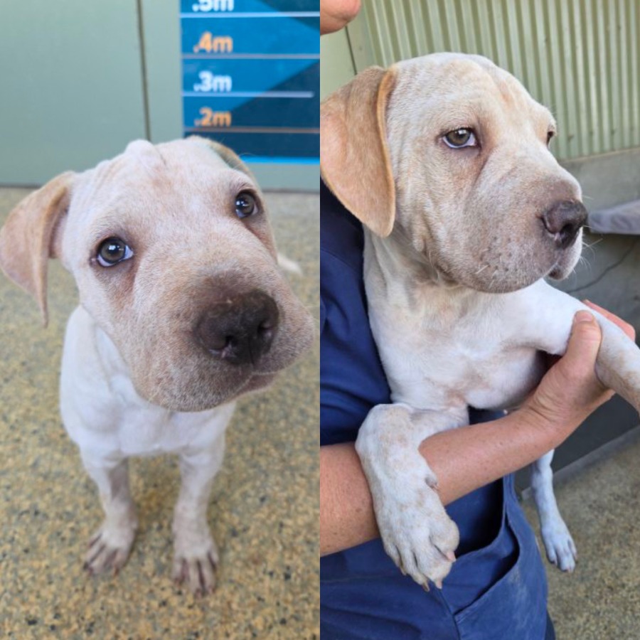 Corban is a 12-week-old male white and tan American Bulldog x puppy with the sweetest little soul and so much love to give! 💕 This handsome boy is full of puppy charm, wiggly excitement and cuddles for days.