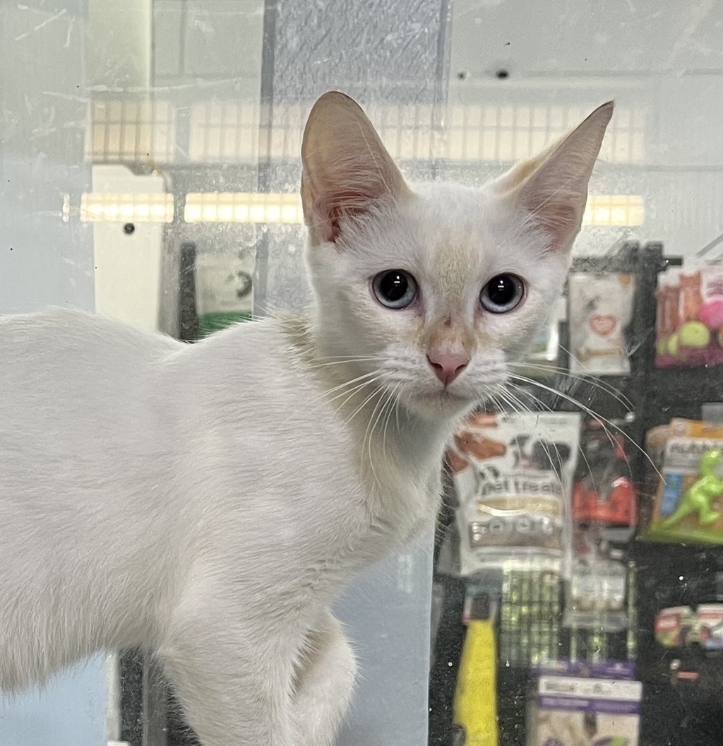 Orion is a beautiful white flame‑point boy with the softest coat, the brightest eyes, and a personality that's just starting to burst through now that he's feeling a little safer. His start in life wasn't the easiest, and coming into the shelter has been a bit overwhelming for him - but oh boy, once he settles... the cheekiness arrives.