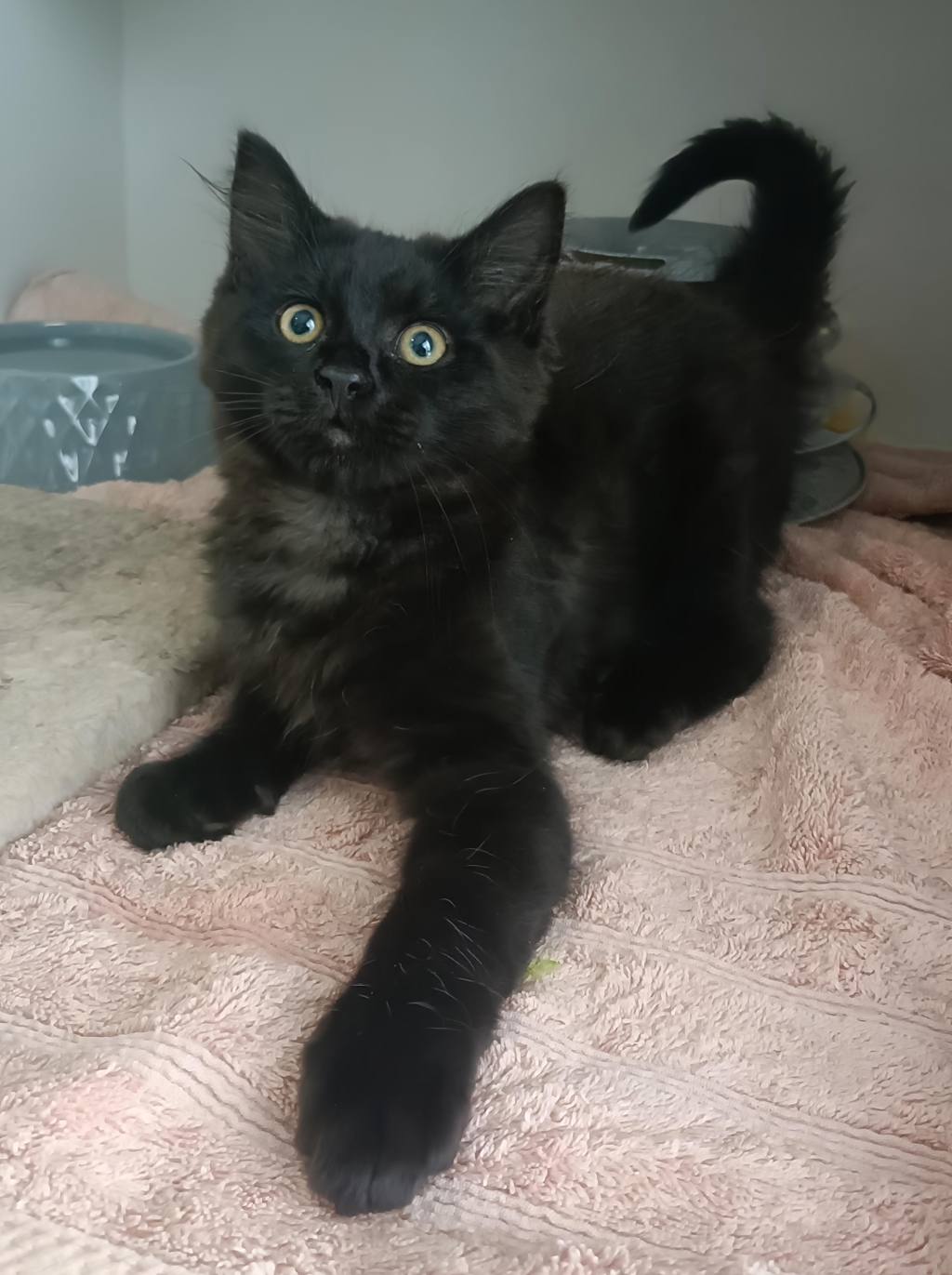 Clarence is a gorgeous black domestic medium hair kitten with the most luxurious fluffy coat and an incredibly laid-back personality. This super chill little guy is wonderfully affectionate - he absolutely loves cuddles, being held, and soaking up all the attention he can get. Clarence is the kind of kitten who melts into your arms and purrs contentedly, happy just to be close to his people.