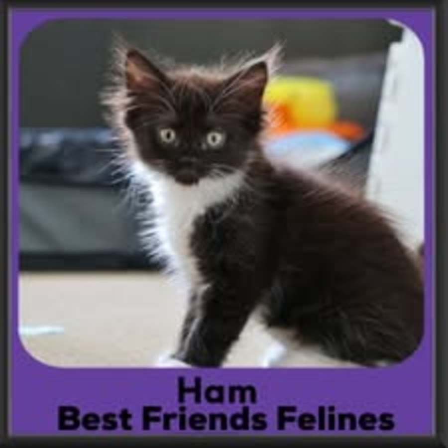 Ham is a gorgeous black tuxedo kitten with the softest fur and the sweetest little soul. She loves pats and demands more so will likely grow into a top‑tier cuddlebug once her confidence fully blossoms.