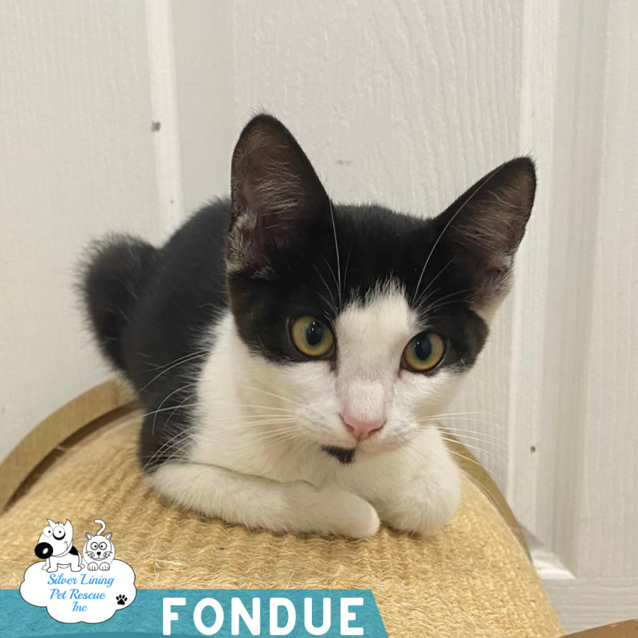 Fondue is a beautiful black and white girl with a soft, sweet nature. She can be a little shy when you first meet her and may take a moment to feel safe and comfortable in a new environment.