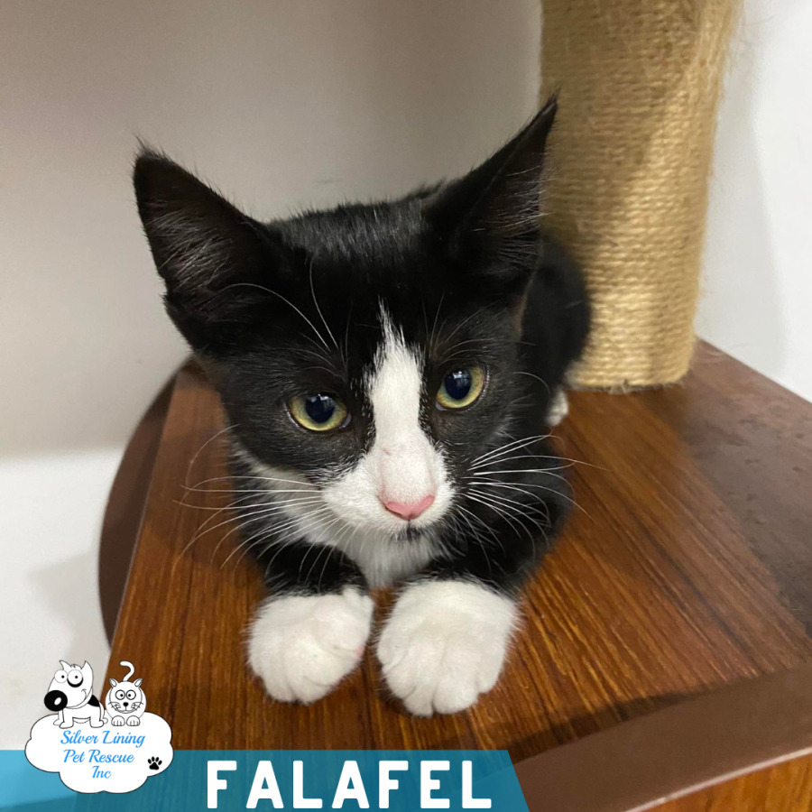 Falafel is a gorgeous black and white boy who is a little shy when you first meet him, but don’t let that fool you — he only needs a short time to warm up before his true sweet nature shines through. Once he feels safe, the purr motor starts and he’s happy to soak up your gentle affection.