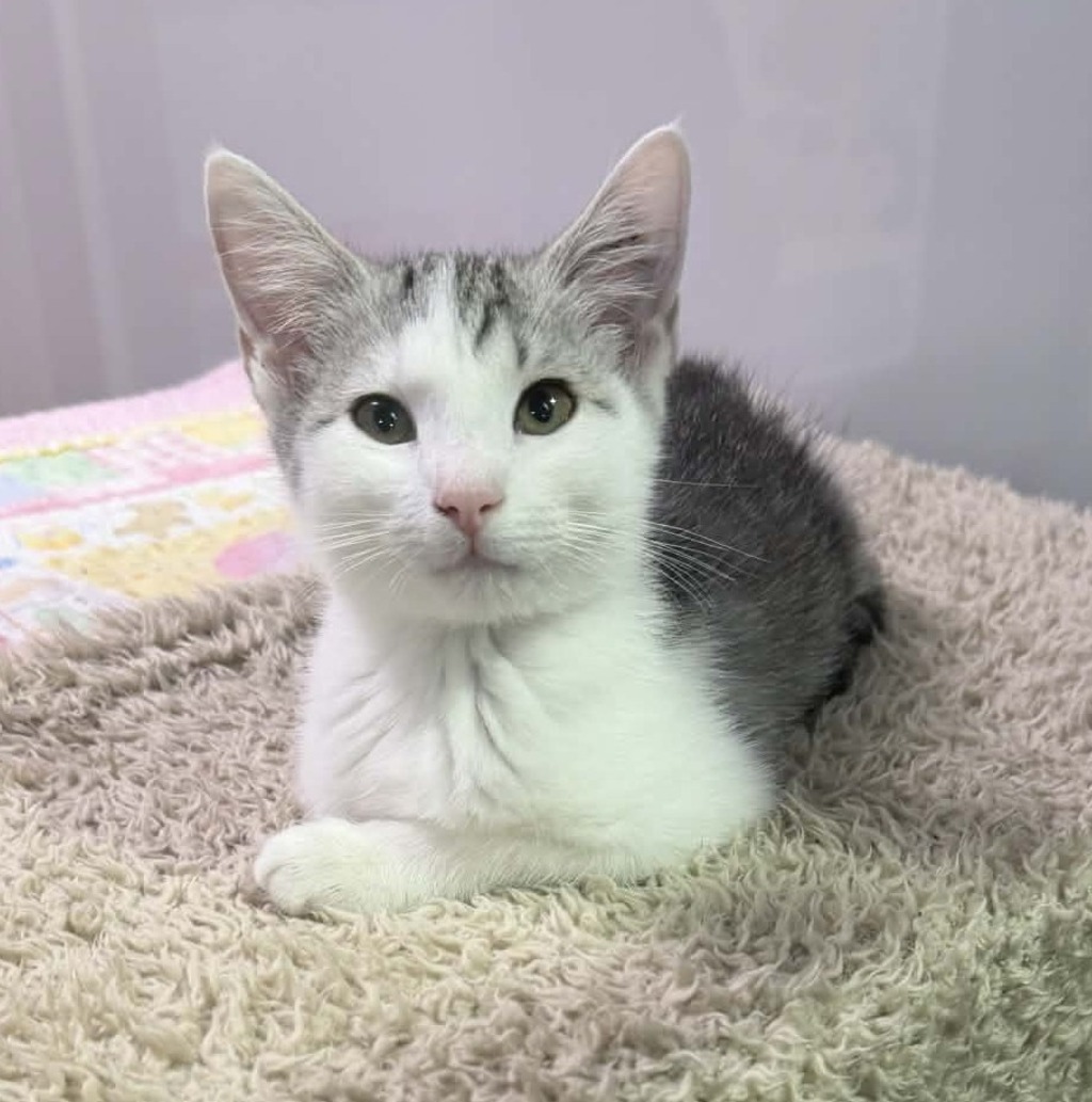 Meet Sylvie, a tiny sweetheart with a giant heart! This adorable kitten is pure affection - if you're sitting, she wants to be on you; if you're lying down, she wants to be tucked right under your chin. Sylvie is the definition of a smoochy, snuggly kitten who believes humans were put on Earth just to give her love.